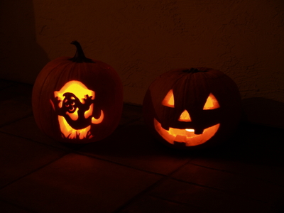 昨日はハロウィン、子供達が楽しみにしていたイベントです。少し雨がぱらつきましたが、子供達は大はしゃぎ、夜も戦利品のお菓子を並べてうれしそうです。ここアメリカでのハロウィンは子供達が中心、お菓子をもらいに訪問する子供達を怖がらせようと、素敵に手入れされた広い庭をショベルカーで掘り起こして墓石を入れ、近づくとセンサーが反応して電動で骸骨が土の中から出てくるなど、とんでもないものをニヤニヤしながら作っています。これらはたった1日のハロウィンが終わると全部撤去されてまたもとのきれいな庭に戻ります。仮装した子供達が、どの家に行っても、本当に気持ち良く対応してくれて、ただの一軒も嫌な思いをすることが無いのが素敵です。写真は今年作ったジャックオーランタン。右は娘作のオーソドックスなもの、左は私が作ったおばけくんです。なかなか好評でした。
