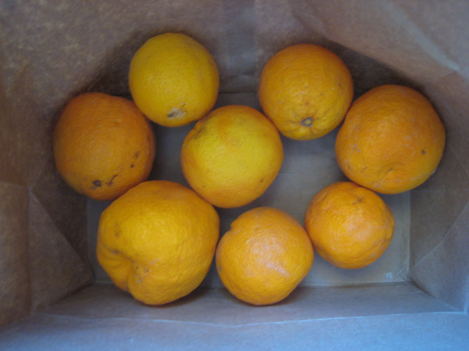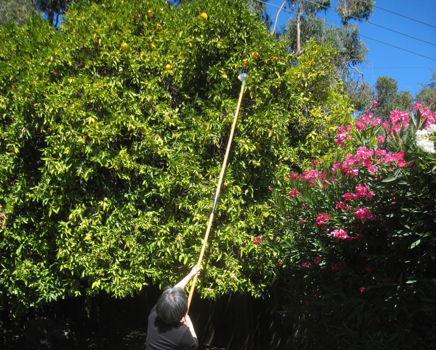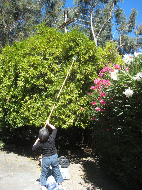 作り方このケーキの決め手は矢張りのオレンジの皮ですね。オレンジの皮の極オレンジ色の部分だけをすりおろした皮(殆ど汁みたいです)をババロアに入れると強烈なオレンジ風味が出るのです。近くに住んでいるお友達に電話をすると、いつも食べきれない程のオレンジを持ってきてくれます。 本人は何故か全く食べない。理由は? 市販の程甘くないというのです。でも摘んで3週間~1月置いておくと凄く甘くなると教えてあげたのですが。そういう訳でこの木は友達宅に生えていても我が家の木のようなもの。とり放題(と言っても取ってくれるのはお友達)、食べ放題なのですから。今回もオレンジババロアを作るのでオレンジが欲しいと言ったら「最後のオレンジは木の上の方だけしか残っていないので取れない」というのです。「自分で取るなら全部持っていってもいいよ」なんて言われたので我が家の果物摘み専門の長竿を持って取りに行きました。見ると本当に木の上の方だけに10個ほど残っているだけ。写真では良く分かりませんが、全体に新しい緑の実はわんさとぶら下がっています。うわ~~~もうちょいなのに。