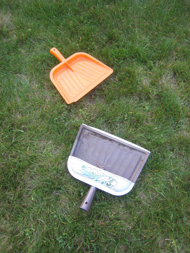 じいさんが芝刈りを始めたので、私もコンクリートの上を掃こうと思ってほうきを持って外に出ました。 コンクリートを掃いて塵取りで枯葉を集めようとしていると、じいさんが「そこはその塵取りは使わないで」って言うんですよ。「これを使いなさい」と言って持って来たのはオレンジ色のブラスティックの塵取り。