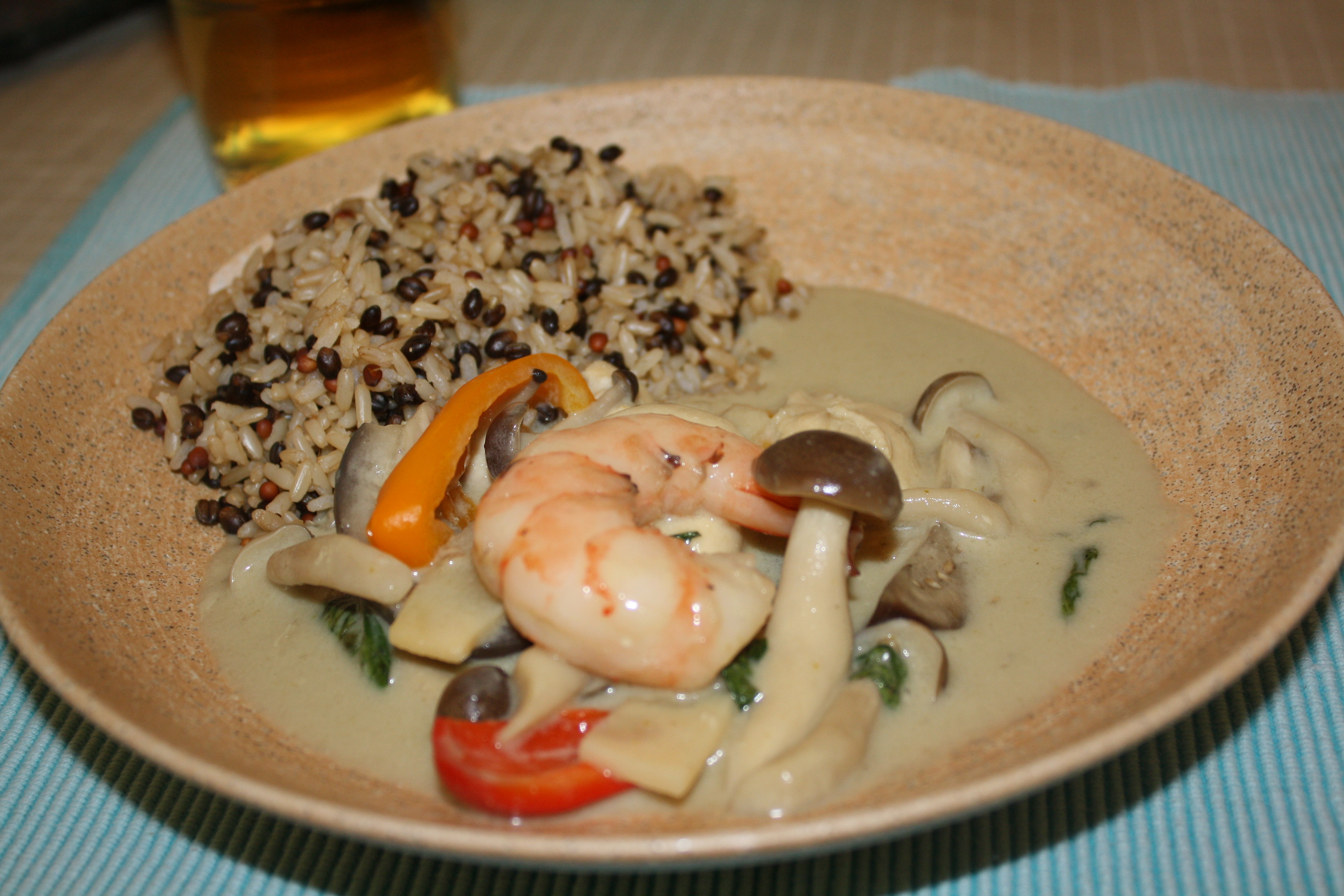 私の周りはお料理上手がたくさんいて、Fumiさんもその一人。彼女は共通の友達Yumiさんのお料理教室に通っており、お料理の腕もめきめきと上がっている。今日は以前から楽しみにしていた「グリーンカレー」をご馳走になりに、Fumiさん宅へお邪魔した。彼女がダイエット中なのを知っていたが、久しぶりに会ってびっくり。ダイエット効果がちゃんと出ている!まだ2ヶ月くらいしかたっていないのに、確実に細くなっている!!3ヶ月ジムに通って一キロも痩せない私はなんなんでしょう(涙)。。。実は朝食抜き(食べる時間がなかった。。。)で行った私。着いてすぐに出されたバナナシフォンケーキに「おいし~い!!」の連続。A君と遊んでいたコリンも飛んできて、夢中で食べていた。シフォンケーキなんて、いや、ケーキなんて最近全然焼いていないので、手作りケーキのおいしさに感激。。。ダイエットや子育て話に花が咲き、あっという間に時間が過ぎていった。コリンとA君も、玩具の取り合いで時々けんかをしながらも、2人だけで2階の子供部屋で遊んだり、ブランケットをマントにして追いかけっこをしたり。途中でFumiさんのお友達Mさんも加わったのだが、共通な友達が2人いることが判明。世間は狭い!そして、じゃ~ん!楽しみにしていたランチタイム!私はタイ料理は大好物だが、外食で食べるのみで自分で作ったことは無い。辛すぎるのは苦手な私にぴったりのお味の「グリーンカレー」「なす、パプリカ、玉ねぎの炒め物」「雑穀ご飯」そして、Mさんが持ってきた「インド風ごはん」、どれも激うま~!(グリーンカレーと雑穀ごはん)コリンもおにぎりとポップコーンチキンをおいしそ~に完食。