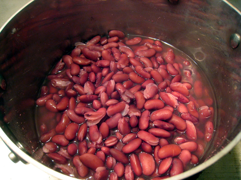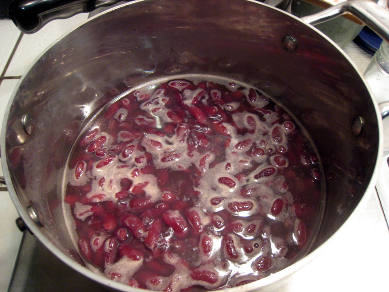 オレンジピールの方法で作れば絶対にできると信じて作ってみましたら、意外と美味しくできました。 一番大切なところは最初の茹で加減でしょうか。 しっかりと軟らかく茹でておく事が大切と思いました。 甘納豆の作り方(1)金時豆を一晩水に浸けておきます。金時豆 300g (これで沢山食べられる)(2)たっぷりの水で沸騰させて4~5分茹でます。 そっとお湯を捨てて、新しい水と取り替えて再び4~5分沸騰させます。 又茹で汁を捨てて水をたっぷり入れて(豆よりかなり多めに)、再び沸騰したら弱火にして、蓋をして豆が軟らかくなるまで茹でます。 早く煮える豆、未だ硬い豆、色々ありますから、どの豆も崩れそうに軟らかくなるまでしっかり茹でてください。 極弱火で50~60分間煮るといいです。崩れそうに軟らかい状態ですからあまり動かさない方がよいです。 豆が破けたので茹で過ぎたと思ったのですが、茹で過ぎくらいが丁度良い硬さに仕上がりました。 丁度良いくらいに茹でた豆は甘納豆になってからちょっと硬めでした。(3)豆が煮えたらそっと、豆の上の部分1割くらいが見えるまで茹で汁を捨てます。 この写真では崩れるくらいに茹でていますけど、未だ硬い豆も残っていました。こんなに崩れた恰好をしていても最後にはちゃんとしまったのが不思議です。