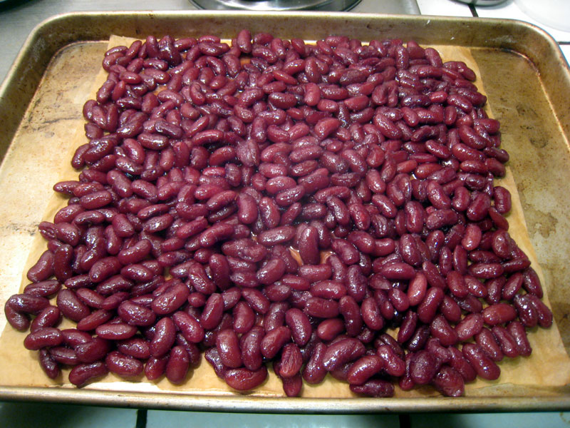 (5)汁ができるだけなくなったら天板の上に薄く広く広げます。 余った汁もそのまま天板におとしてOKです。 茹で過ぎて汁が餡子のようになっていたら上からかけないほうがよいです。 80度C(200度F)くらいでオーブンに入れて乾かします。 4時間くらい。 その間に何度か混ぜて下の濡れた豆が上に来るようにしてください。 同時に硬さを確認しましょう。 ここで乾燥し過ぎると硬い甘納豆になります。。 完全に乾かす必要はないです。 汁が更になくなれば大丈夫。