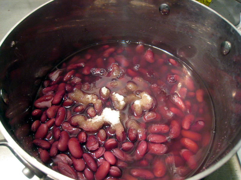 このくらいまで茹で汁を捨てます。お砂糖を加えてお鍋を揺すって混ぜます。 次に塩を加えて同じようにして混ぜます。 ここで6時間くらい室温で放置して砂糖を豆にしっかりとしみ込ませましょう。 砂糖 300g (豆と同量)塩 小さじ1/2