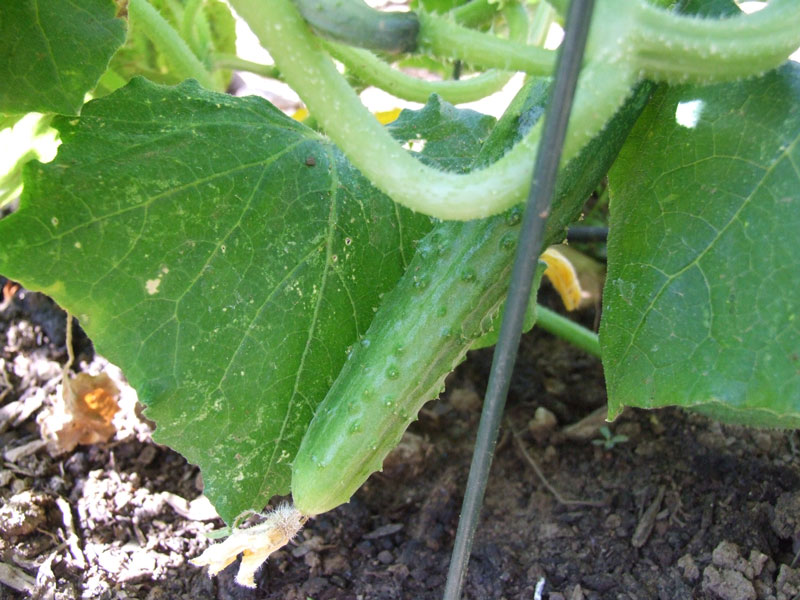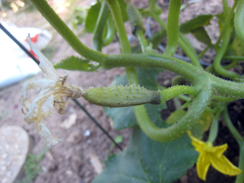 ところが!3日前からちょっと太めになってきた赤ちゃん胡瓜が一本あるのです。 これもきっとだめだろう、だまされるまいと(後で失望するので)自分に言い聞かせながら、今朝見るとどうも本当に成長しているみたいなのですよ。