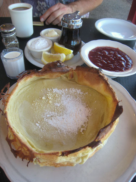 じいさんはレストランに出かけるのが大嫌い。でも偶に朝食だけは行こうといいます。私は出かけられるだけでも嬉しいので行き先はいつもじいさんにお任せ。そしたら今朝も又あそこに行こうというのですよ。れいのあそこですよ。もう私はあそこだけは嫌だと言いました。それよりこの1年ほどず~っと行ってみたいなと思っているレストランが道路の真向かいにあるのです。「オリジナルパンケーキハウス/The Original Pancake House」10年程前にここで食べたダッチベービー(Dutch Baby)が美味しくて美味しくてもう一度食べてみたいと思っていたのに物凄く人気レストランだったので長く待たされたらじいさんは2度と行かないと言いましてね。それっきりでした。最近レストランも不景気ですから電話をかけてどのくらい待たされるかときいたら誰も待っていないって言うのですよ。で やっとじいさんが行く気になってくれたわけです。あぁ~今日はあっち側じゃなくて良かった。