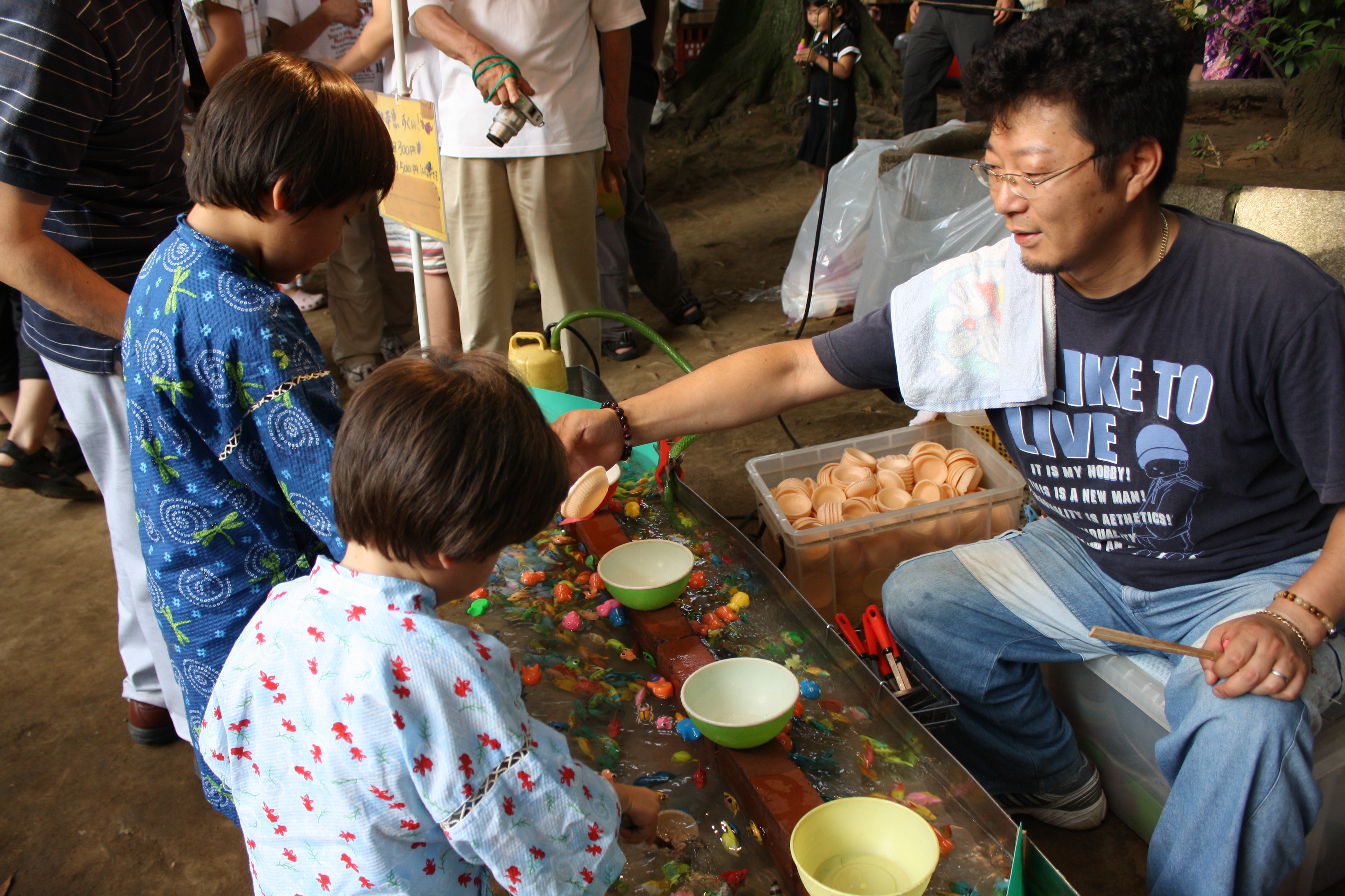 月曜日は、近くの神社の中祭があった。秋の本祭に比べると小さいものなのだが、この地域では夏のビッグイベント。リアムもコリンも、夕方からばぁばに買ってもらった甚兵を来て、兄と一緒にお祭りへ。私が子供の時からあった出店(しかも同じ場所!)がいくつもあり、とても懐かしかった。二人は「宝釣り」「ヨーヨー釣り」などをして遊んだ。