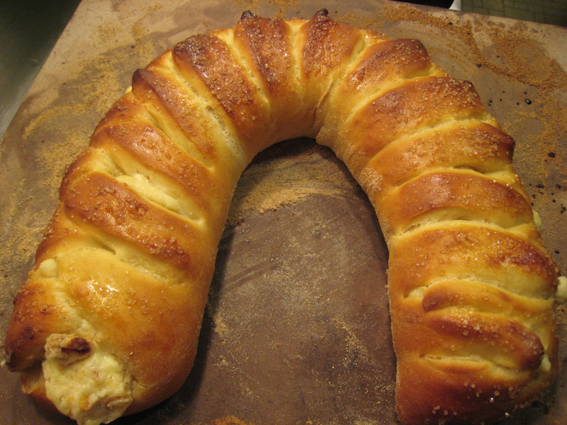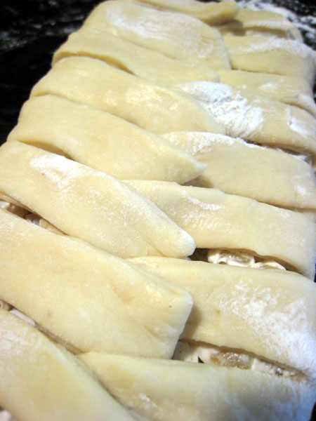 (5) 溶き卵白を刷毛で表面に塗り、上からざらめを散らします。 190度C(375度F)に予熱したオブンで20分焼く。美味しく作るコツは網目を作る時、生地が重ならないように少しりんごが見えるくらいに重ねた方がよいです。下は生地を増やしたら長くなりすぎて天板に真っ直ぐ置けなかった時、曲げて作ったパンです。