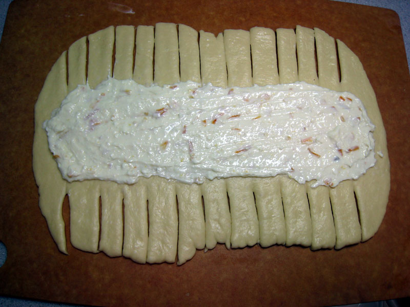 (4) 両側の端にはカッターで2.5~3cm幅で切り込みを入れていく。 切込みの数は反対側と同じ数に入れること。切り込みを交互に中心に向けて折りたたみ、やや編み目のようにします。 天板に移して最終醗酵させる。 30度で20分ぐらい。 醗酵温度にもよりますが最終醗酵はあまり大きく膨らませない方が良いです。