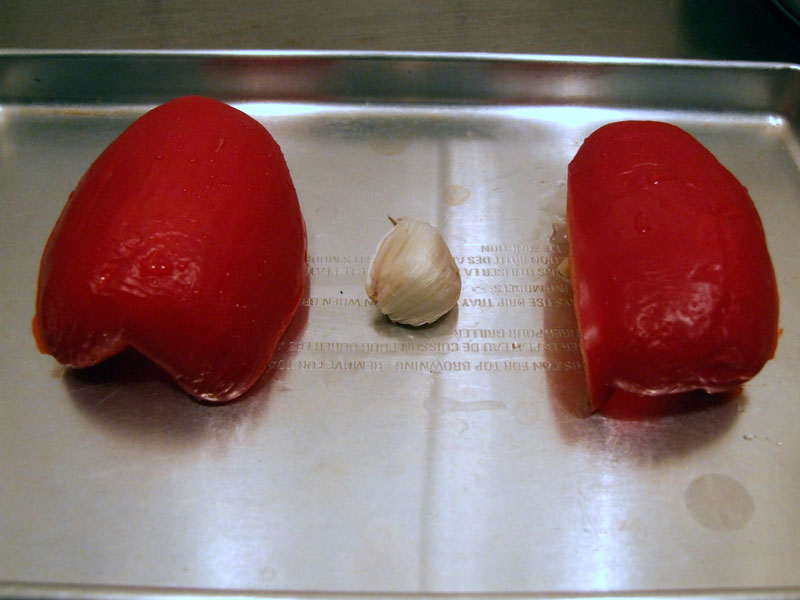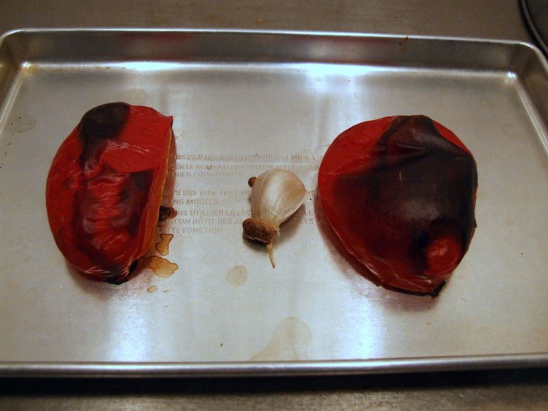 ローストガーリック、ロースト赤パプリカ入りのフムスの作り方(1)ヒヨコマメの缶詰の汁をきっておく。 赤パプリカ、にんにく(皮を剥かないで)オーブントースターで焼く。 黒く焦げた赤パプリカの皮を剥く。 にんにくも皮を剥く。 にんにくの中は火が通ってどろっとしています。ヒヨコマメ 缶詰 1缶 (439g入り、汁を除くと豆だけで正味265g位 茹で汁はとっておく)赤パプリカ 半個にんにく 1片