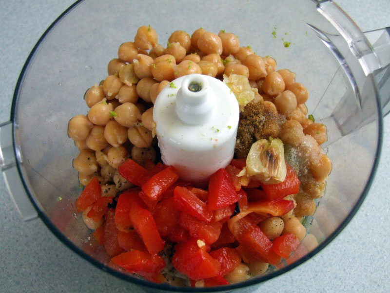 焼いた後(2)下記の材料を全てフードプロセッサーか、ミキサーに入れて糊状になるまで攪拌して出来上がり。ヒヨコマメ 正味265g位 茹で汁なしタヒニ 大さじ2 (又は練り胡麻 大さじ1)(1)で用意したにんにく 1片(1)で用意した赤パプリカライム汁 又はレモン汁 小さじ2ライムの皮 又はレモンの皮 少々 おろす粉クミン 小さじ1/4粉コリアンダー 小さじ1/8塩 小さじ1/3~1/2 好みで加減砂糖 小さじ1/2エキストラバージンオリーブオイル 大さじ1~2香采(コリアンダーの葉) 刻んで大さじ2くらい あればヒヨコマメの茹で汁 ペーストのゆるさを見ながらお好みの量で加えてください。 上から粉パプリカ、刻みパセリ、刻み香采を振りかけると良いでしょう。