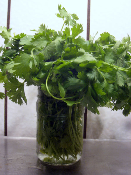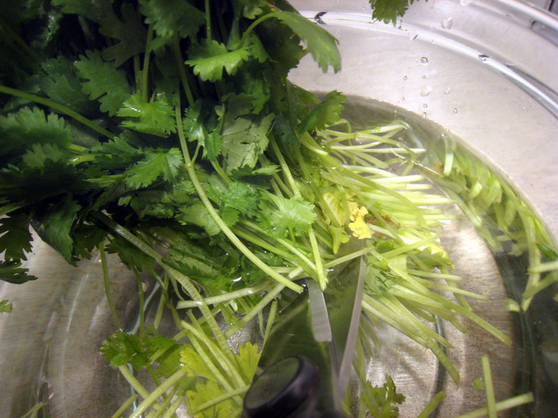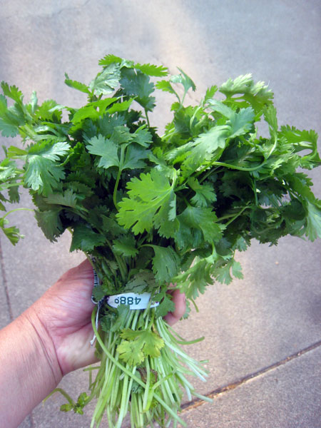 カイシャさ~ん!わかりましたよ~~!シラントロ(香采)を1週間以上100%フレッシュに持たせる方法がわかりましたよ~~!下が8月7日に買った直後の写真です。お見苦しい手ですみませんけど。