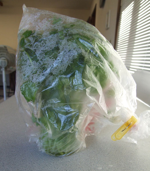 ここまでは今までしていたのですよ。ところがこれでは冷蔵庫の中で葉が乾燥するし、毎日水も減ってしまう。そこでばあさんの素晴らしい頭が閃いた!