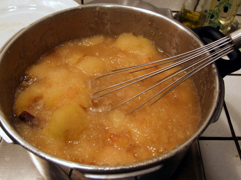 泡だて器で混ぜると自然にピュレになります。これが熟したりんごならお砂糖は全く入れないでお塩とシナモンだけで十分に美味しいのですが今日のりんごはちょっとお砂糖無しでは無理でした。塩 小さじ1/2砂糖 150g粉シナモン 少々 を加えて出来上がりです。アメリカではこのアップルソースを朝ごはんに食べます。 パンケーキとかトーストに添えて。私はオートミールに入れて食べるのが好きです。