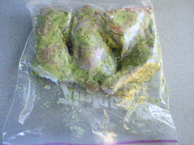 (3) ゴムベラでペーストをすくい、チキン一つ一つ、全体に塗ります。 冷凍バッグに入れて1晩 浸けます。