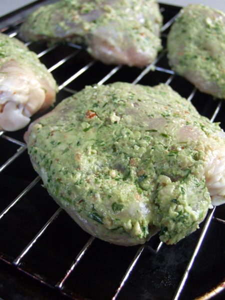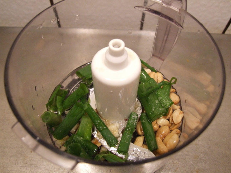 昨年いとこが丸ごとチキンは大き過ぎて面倒だというので足のレシピばかり続いておりますがこれで今年は終わりにします。そうでなくても我が家はチキンが多いのですが。スープをよく作るのでチキンは冷凍庫に常備しているし。買って来た日は冷凍にする前にこういうマリネにしてしまうのです。夜時間がある時に下味をつけておけば翌日は焼くだけで簡単なものですから。しかも我が家は二人だけなので4本浸けたら、翌日2本は冷凍バッグのまま冷凍庫へ。忙しい時に解凍して焼くだけ。とても便利です。作り方チキンの足3本、又は腿肉4枚分(1) チキンの皮は付けたままでも除いてもどちらでもよいです。 コレストロールの問題で我が家では皮は剥いでいます。 チキンは綺麗に洗って水を切り、ペーパータオルで水分を取ります。(2) 下記の材料を全部フードプロセッサーに入れてペースト状になるまでよく攪拌します。 ピーナツは少々粒々があってもOKです。★ ピーナツ 山盛り大さじ2 ★ 万能葱 2~3本★ にんにく 1~2片★ 塩 小さじ1+1/8★ サラダオイル 大さじ3★ 胡麻油 小さじ1