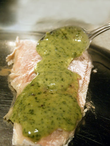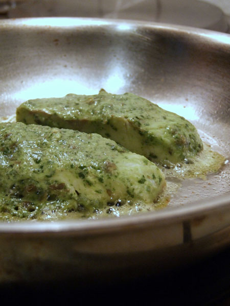 海老150gに大さじ2くらいのソースを混ぜて 熱くしたフライパンに重ならないようにのせて、半分下の方が白っぽくなったら、裏返して反対面を焼いて出来上がり。 フライパンを熱くしてから海老を入れないと水分が出てきて綺麗な焼き目がつきませんから気をつけてください。 下に敷いてあるのは油で揚げた春雨です。 お魚の場合は両面に軽く粉を振り、塩、胡椒を振りかけて、サラダオイルを熱くしたフライパンに入れます。 皮のついたお魚の場合は皮を下にして炒めてください。 上からソースをのせて蓋をして蒸してください。