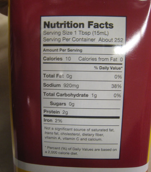日本産のだし醤油です。 ラベルによると100ccにつきナトリウム2900mgと出ています。