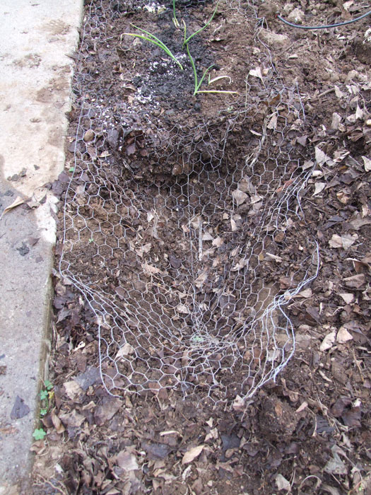 穴を掘ったら下から掘りねずみにやられないように網を敷きます。