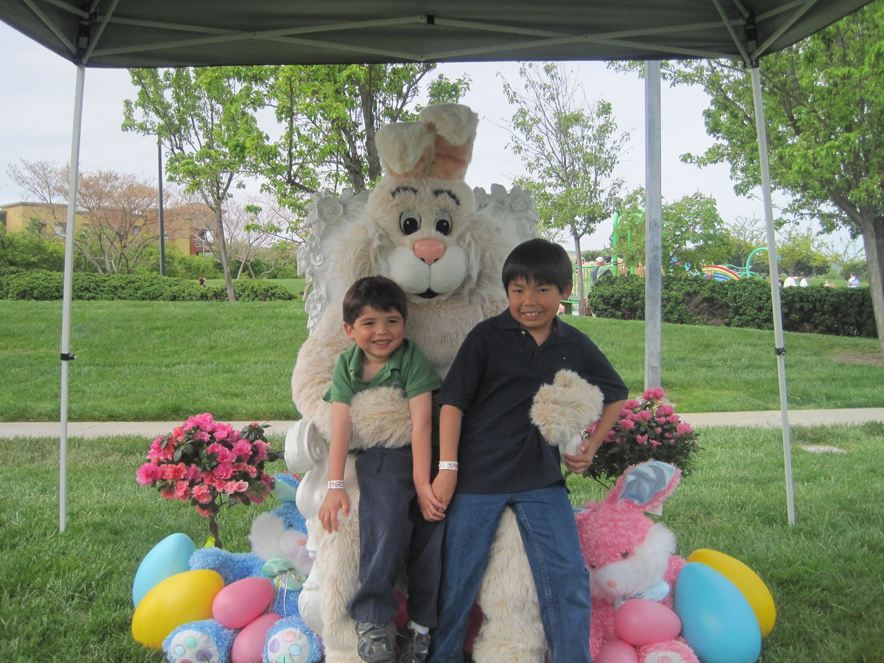 イースターの週末。金曜日はリアムの小学校が早く終わったので、お弁当を持って一緒にコリンのプレイグループに参加。ところがリアムは「僕、こんな赤ちゃんみたいなことしたくない」と、エッグハントは不参加。大人っぽくなった姿を見せたくなったのか?でも土曜日の市主催のエッグハントは、毎年恒例で1歳の時から毎年かかさず参加しているからか、喜んでリアムも参加。このイベントはエッグハントだけではなく、ボール投げなどのゲームコーナーやジャンピーハウス、ウサギやヤギを触れる移動動物園など盛りだくさんで、2時間とても楽しめた。まだイースターバニーの存在を信じているリアム、一緒に記念撮影。このバニー、毎年同じで薄汚いのが特徴(笑)。