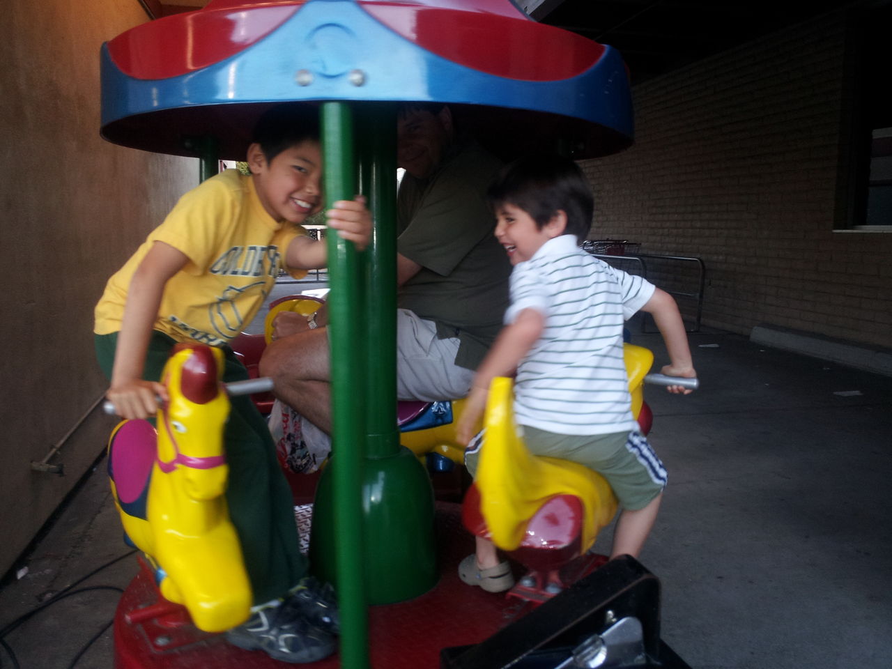 レストランの近くにあった小さな乗り物。よく見ると。。。あれ、3人乗ってる?!