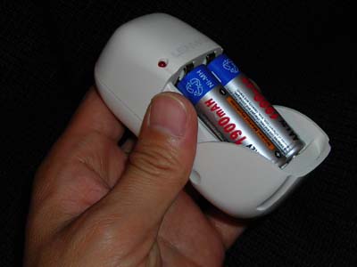 こんな具合にぱかっと開いて、中に単三2本か単四2本がセットできます。ニッカド及びニッケル水素に対応し、急速充電ではありませんが小型で持ち運びに便利です。あと、この充電器、めずらしく1個でも充電可能です。通常こうした充電器は2個単位で充電するものが多いため、これは便利です。私の場合、デジカメ等に単三電池を使用したものを多く使っていますので旅先に充電器も持って行くことが多く、そんな場合にこのたまごはとっても小型で携帯性ばつぐんです。Lenmar Model: EGG-01