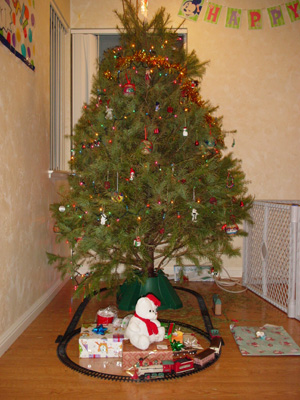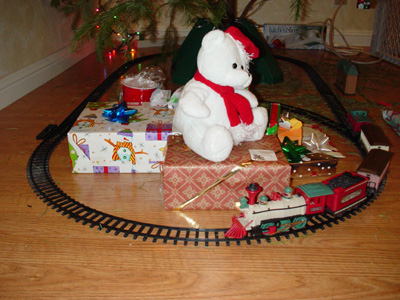 ツリーの下にはプレゼント。その周りを電池で走るおもちゃの汽車がぐるぐる回っています。娘はこの汽車を夜中じゅう走らせてサンタさんに見せると言っていますが‥とってもうるさいので止めると思います。