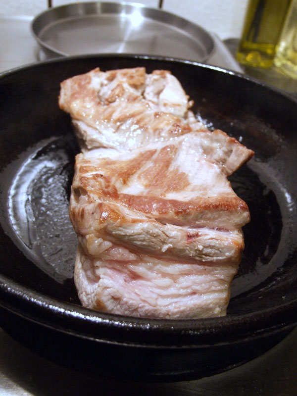(3) フライパンを熱し、豚肉を脂身を下にして入れ、全体をきつね色に焼きつける(肉の表面を焼きつけることで、うまみを中に封じ込める)。