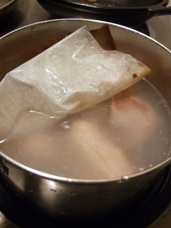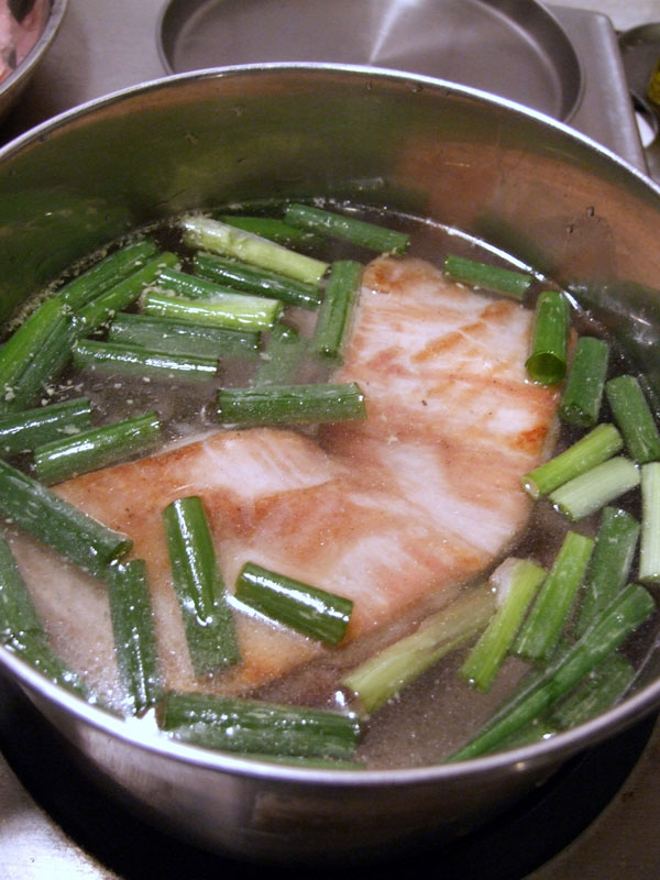 (4) 厚手の鍋に3、しょうがの皮、ねぎを入れて、かぶるくらいの水を注ぐ。強火にかけて沸騰したら弱火にし、アクと脂を取り除く(時間をかけて下ゆでをする)。紙ぶたをして、そしてお鍋の蓋もして 1時間30分ほど煮る。