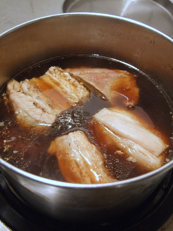 (6) 鍋に肉をきっちりと入れ、肉の上1cmぐらいまで水と紹興酒注ぐ。 強火にかけ、沸騰したらアクを取り、紙ぶたをして弱火で15分間煮る。