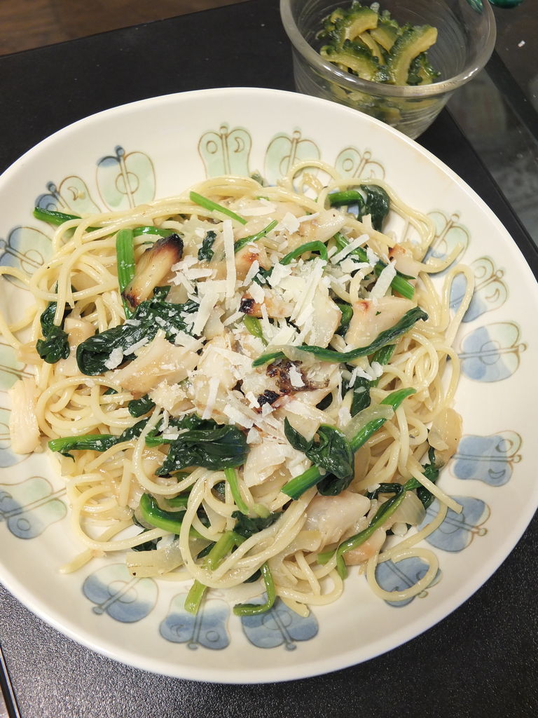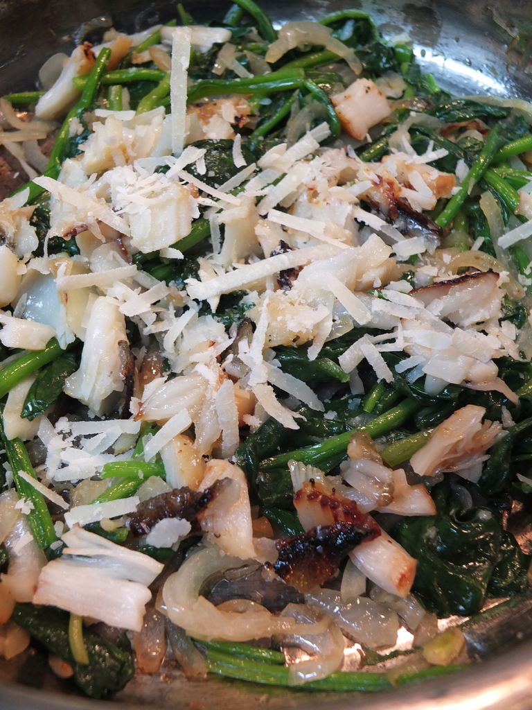 玉ねぎ ほうれん草 にんにくを炒めて塩 胡椒で調味