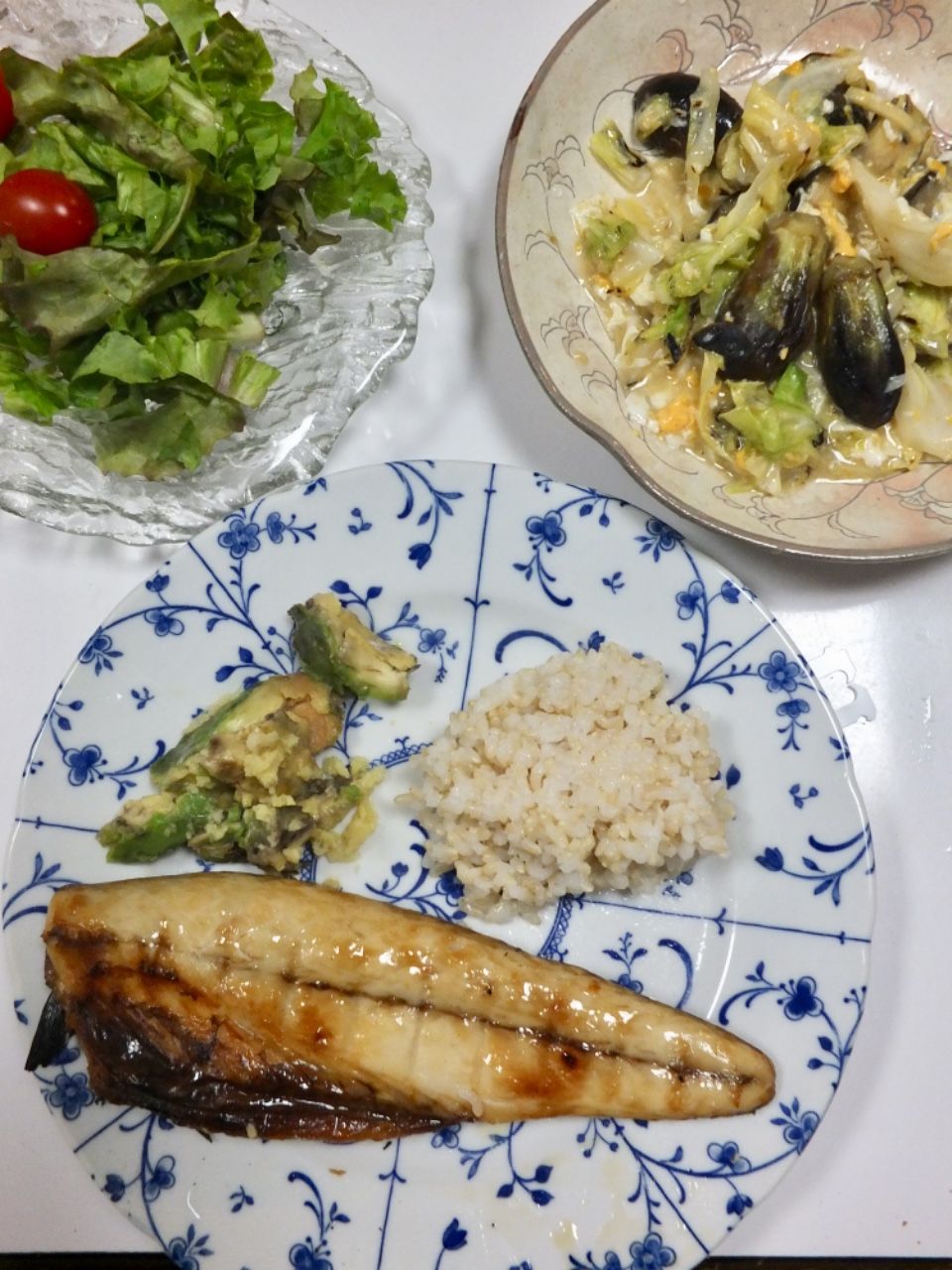 鯖の甘塩焼き 生姜とアボカド 茄子とキャベツと卵あんかけ サラダと玄米です