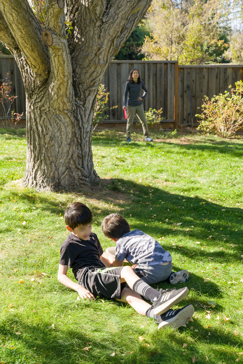 子供達が庭でフリズビーをしたり