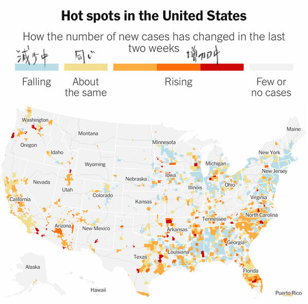 昨日6月9日にニューヨークタイムズが発表した現在アメリカにおけるコロナのホットスポット