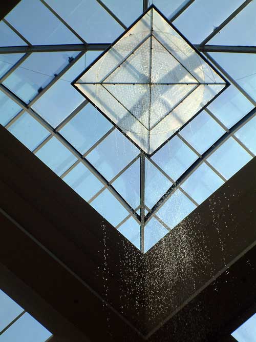 大その天井をよ~く見ると、何と!天井から雨漏れが! 水が滴り落ちています! 何と5階の吹き抜けの天井からですね、水が一階まで落ちてるんですよ! 下のテーブルもお客様も勿論濡れちゃいますわ!